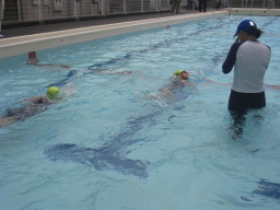 | 3・4年児童は,25メートルのクロールを水泳学習の成果として発表しました。 そして,チャレンジでは,クロールで50メートル泳ぐことに挑戦しました。二人とも,スイスイ泳ぎ,見事,目標を達成することができました。 |