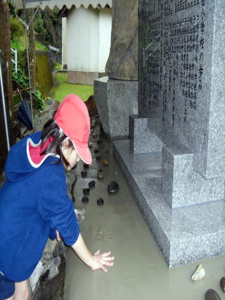閉校記念碑の土台につける玉石を全校児童と保護者,先生たちで近くの海岸まで取りに行きました。 「どの石がいいかなあ。」と考えながら,三人の児童は記念碑として思い出に残る石を一つ一つ集めました。 そして,次の日,自分たちの手で,石を一つ一つ記念碑の土台にのせました。自分の手形と名前も記念に残しました。 児童が置いた玉石と児童の手形は,記念碑除幕式のとき,御覧ください。