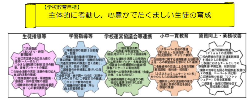 学校教育目標は,昨年度の教育目標と変わりはありません。教育の最終目標である「自立」を 目指し,その核心となる「考えて動く」考動力を身に付けさせることを本年度も主眼に置き,教育活動を進めてまいります。 重点取組事項も,昨年度同様五つの歯車で表しています。それぞれの歯車は同じ方向・力で回ることで,更に推進力が高まります。一方で,嚙み合った歯車は,一つでも止まるとすべ歯車に影響します。それぞれの取組がよりよくつながることで,その思いは広がり,魅力ある学校づくりに向けた推進力になります。また,本年度の重点取組事項におけるポイントは「学校DX」です。このことについて今後,学校の具体的な取組状況を含めて,皆様にお知らせしてまいります。