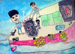 魚釣り大会の思い出や,網仕事をしている人などを細かいところまでていねいに描きました。