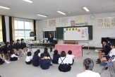 | 読書集会をしました。各学年の代表のお薦めの本の紹介や図書委員の楽しい紙芝居がありました。 今年は司書補の田代先生に読み聞かせもしてもらいました。 |
