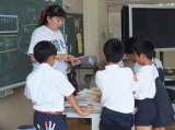 | ALTやGTに協力していただいている英語活動の取り組みの様子です。 | 中学校の美術科と社会科教諭による専門性を生かした交流授業の様子です。 | ||